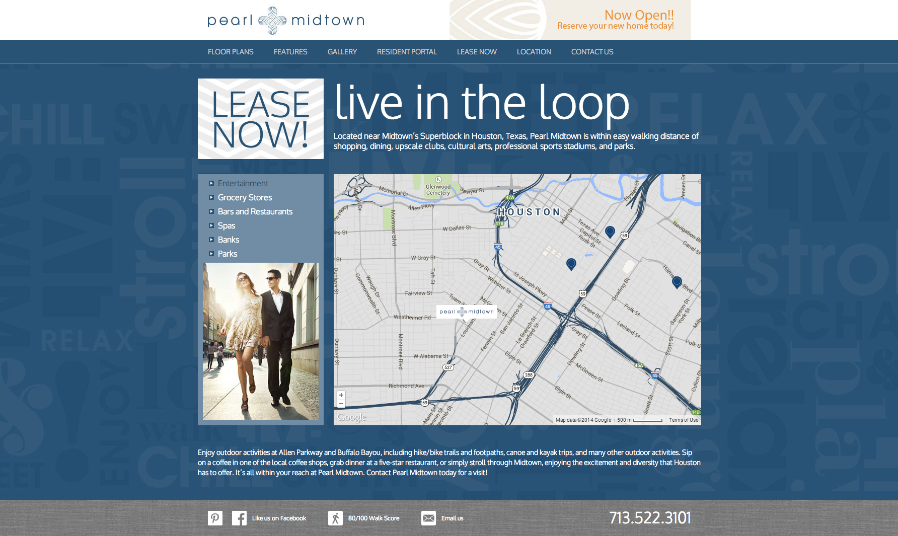 FirmDesign specializes in the multi-family industry. The Pearl Midtown website highlights one of Houston's top A properties. The site features modern web technology such as responsive design and a custom content management system.